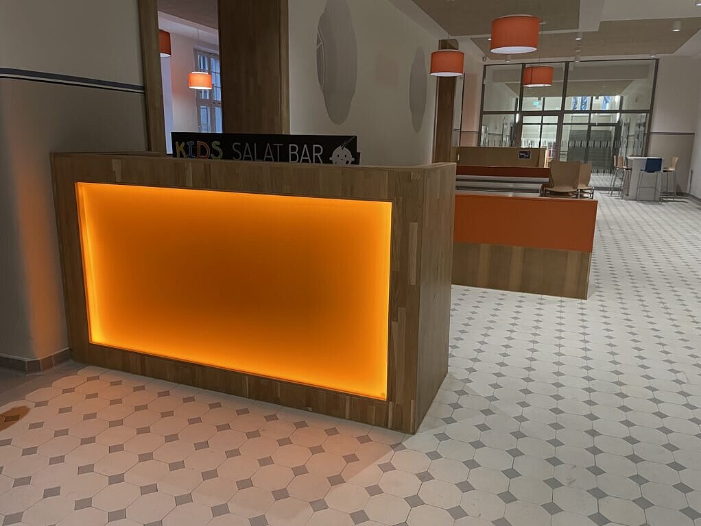 Abwasser- und Trinkwasserinstallationen wurden durchgeführt. Es erfolgte eine zentrale Warmwasserbereitung der Dusch- und Waschbereiche der Turnhalle und Ausgabeküche.