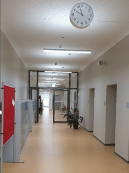 Die Lüftung der Unterrichtsräume und der Turnhalle wurden mit einer Ventilatorgestützten Kippfensterlüftung umgesetzt. Über reaktivierte Bestandsschächte wird die Abluft abgeführt, die Zuluft strömt über die Fenster nach.