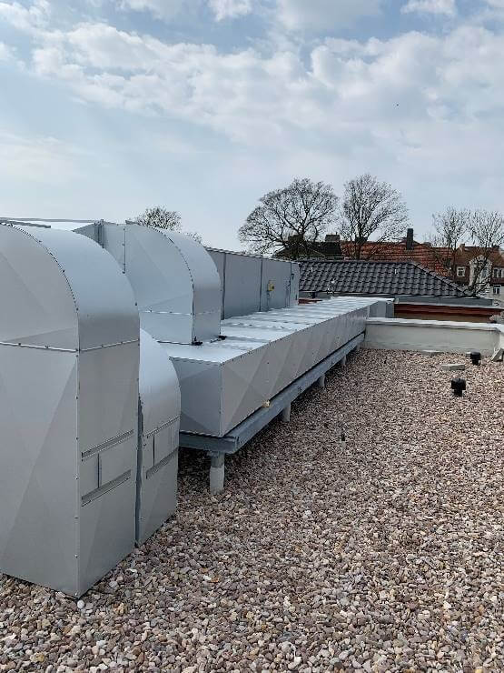 Die innenliegenden Gruppenräumen sowie alle Sanitär- und WC-Bereiche werden über eine zentrale Zu- und Abluftanlage (Dachaufstellung) versorgt. Des Weiteren erfolgt die Küchenlüftung über eine Zuluftbox mit Nachheizregister und einen separaten Dachventilator.